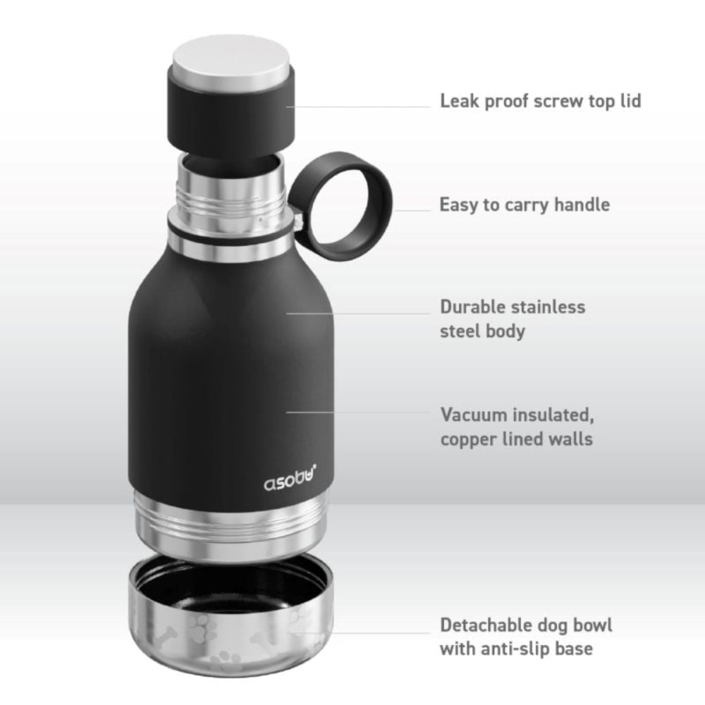 Zadbaj o nawodnienie swoje i swojego pupila – z czarną butelką Asobu Stainless zawsze macie dostęp do świeżej wody, gdziekolwiek jesteście!