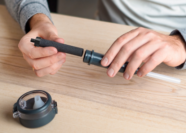 - Napełnij butelkę zimną wodą kranową, włóż filtr i zakręć ustnik.